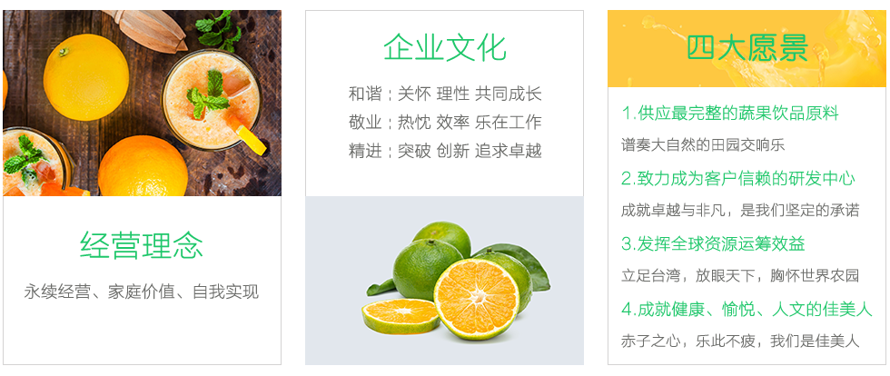 我們秉承著專業(yè)技術(shù)及嚴(yán)謹(jǐn)?shù)慕?jīng)營(yíng)態(tài)度,在不斷地鉆研、開發(fā)與創(chuàng)新下,成功地將四季水果的新鮮風(fēng)味與營(yíng)養(yǎng)長(zhǎng)期完整的保存。十月份果實(shí)成熟后,我們將最新鮮的果實(shí)用最天然的方式加工成果汁。