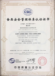 公司于2008年按ISO 9000標(biāo)準(zhǔn)建立質(zhì)量管理體系,同時(shí)取得ISO 9001質(zhì)量體系認(rèn)證證書、HACCP 體系認(rèn)證證書,并于2018年取得ISO 9001:2015質(zhì)量體系認(rèn)證證書。公司于2014年按ISO 22000標(biāo)準(zhǔn)建立食品安全管理體系,同時(shí)取得ISO 22000食品安全管理體系認(rèn)證證書。南充佳美不斷提升與進(jìn)取,于2018年取得了FSSC 22000食品安全體系認(rèn)證證書。